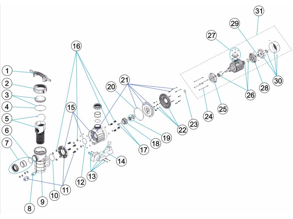 Tělo čerpadla i základna z tepelně vytvrzeného plastu, hřídel motoru z z nerezové oceli AISI-420 s dvojitou izolací, ucpávka z karbidu křemíku a nerez oceli AISI-316, speciální těsnění odolné vůči slané vodě a nízké koncentraci ozonu. Elektrické krytí motoru IP 55, koš zachycovače hrubých nečistot o objemu 8l s průhledným víčkem. Sací výška bez zpětného ventilu max. 1,5m. Připojení na sání i výtlaku D90.
